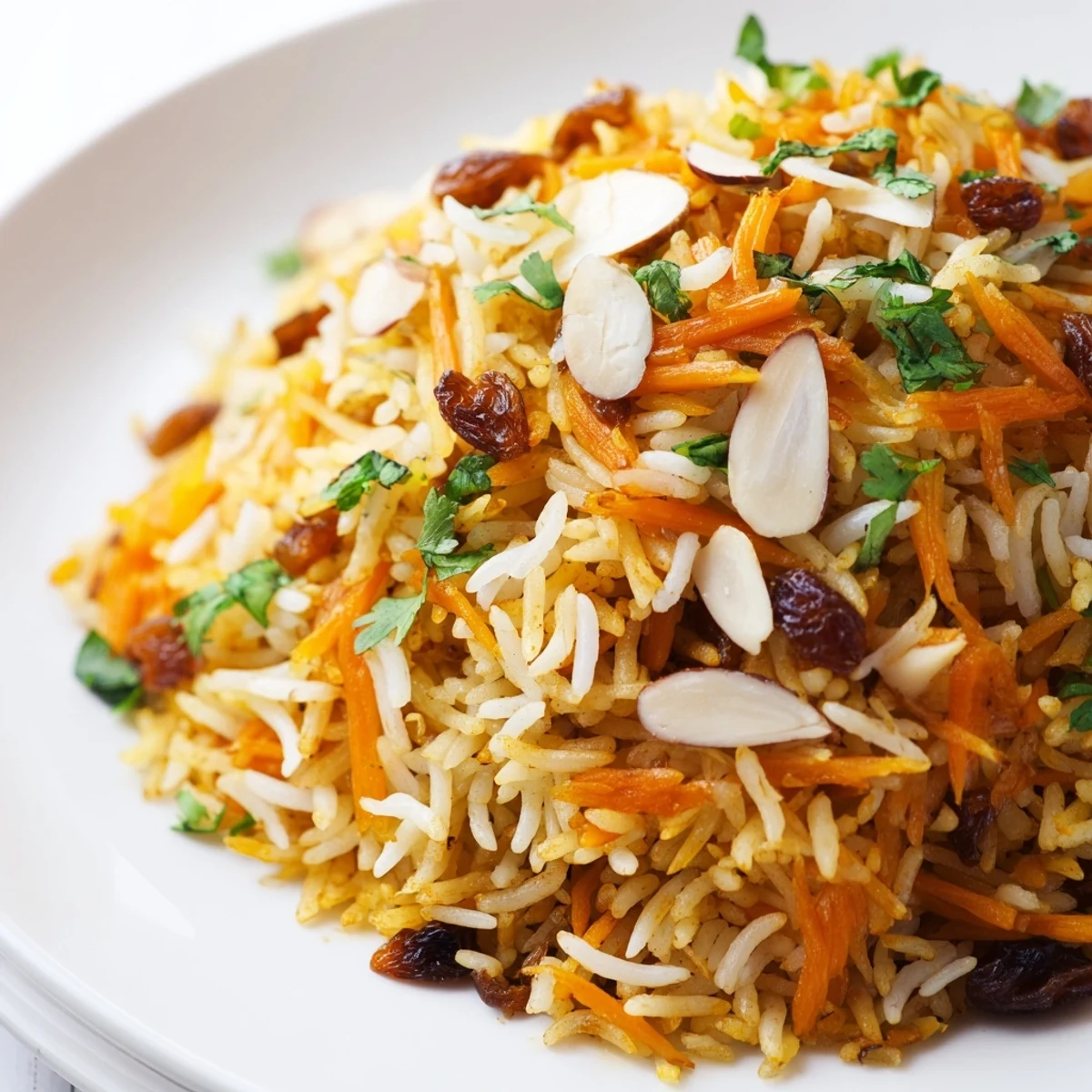 The rice is gently sautéed with aromatic spices, then simmered until fluffy and tender. A crown of caramelized julienned carrots, plump raisins, and toasted almonds adds sweetness and texture contrast.
