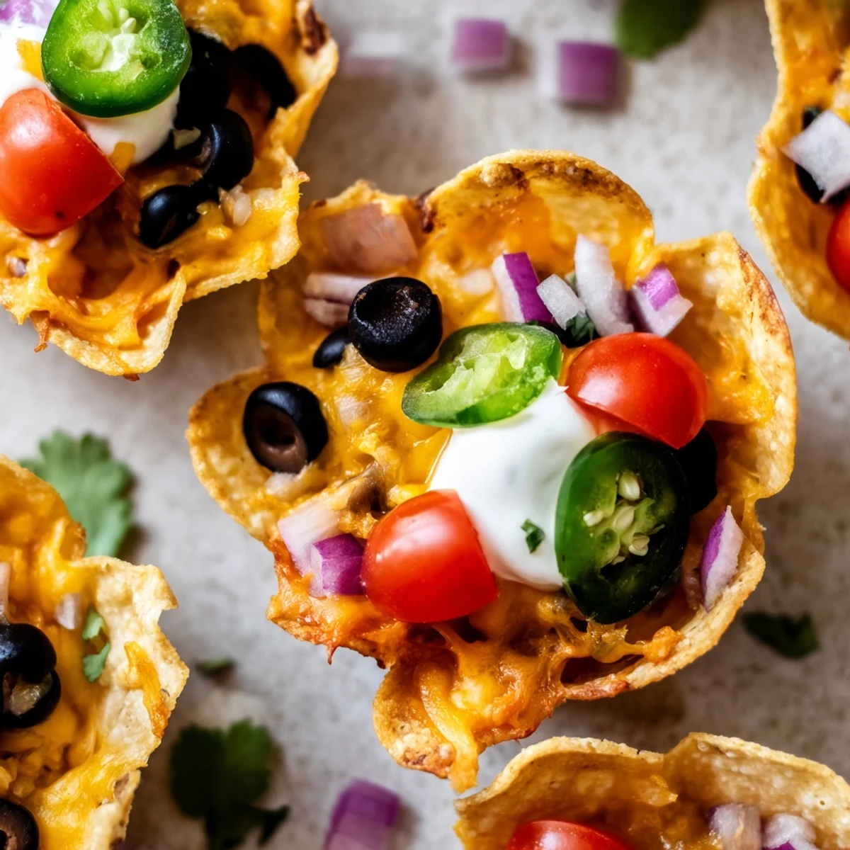 These bite-sized nacho cups transform classic tortilla chips into edible vessels filled with melted cheddar and Monterey Jack. Each crispy shell gets loaded with black beans, diced cherry tomatoes, sliced black olives, red onion, and fresh jalapeño before baking until golden and bubbly.