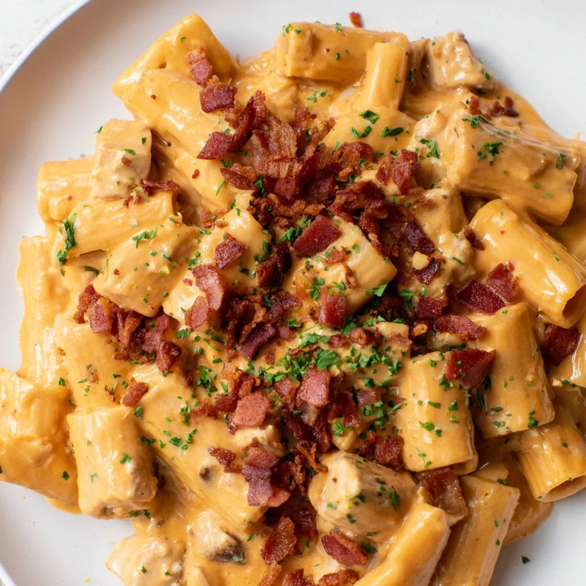 Indulge in this decadent pasta dish combining tender diced chicken seasoned with smoked paprika and aromatic spices. The rich, velvety sauce blends softened cream cheese with heavy cream and sharp cheddar, coating every bite of al dente penne or rigatoni. Crispy chopped beef bacon adds a savory crunch throughout, while fresh spring onions, parsley, and chives bring bright herbaceous notes to balance the creamy richness. Ready in just 45 minutes, this hearty American-style main dish serves four and delivers satisfying comfort with its perfectly melded flavors and textures.