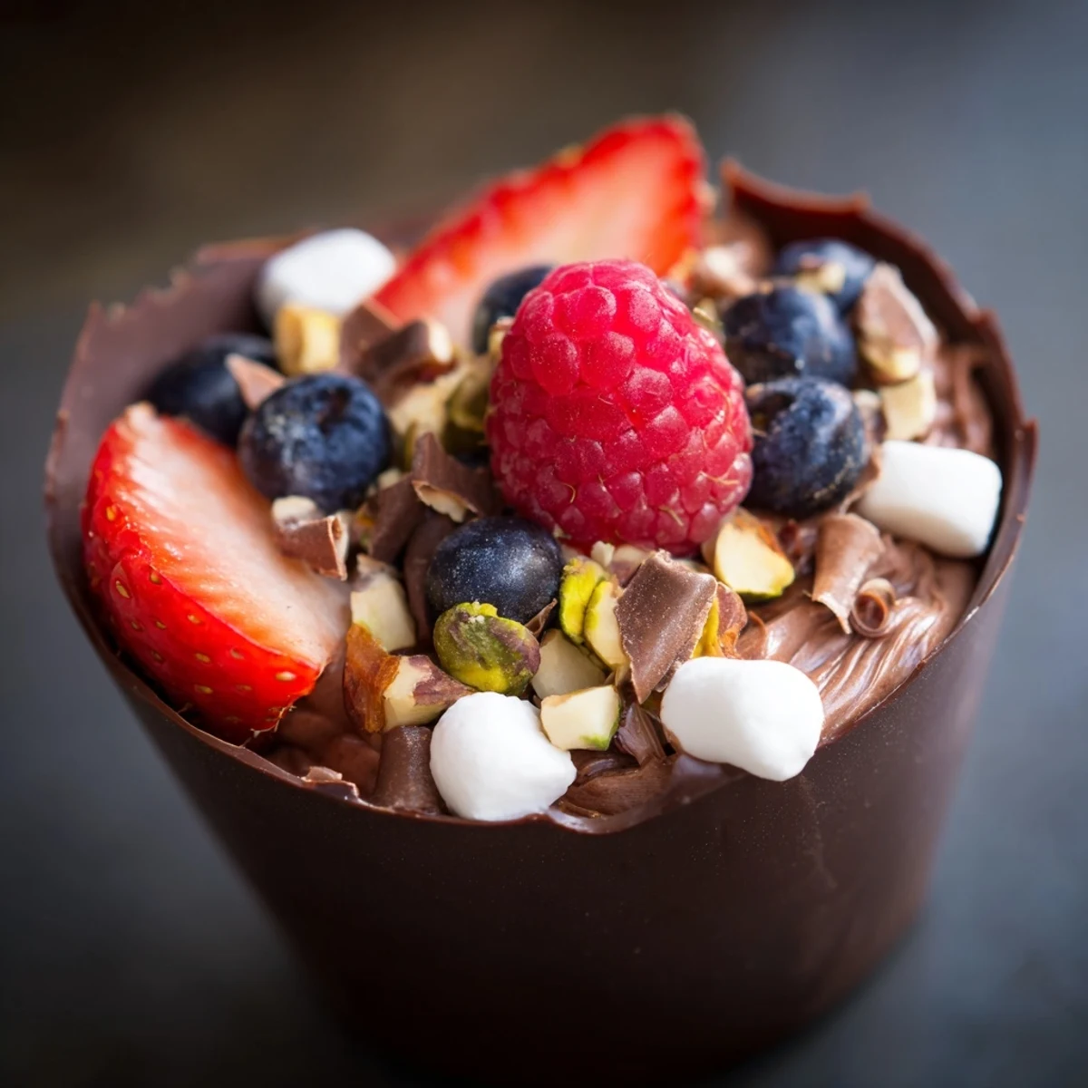 Create stunning chocolate grazing cups featuring silky dark chocolate mousse nestled in handmade edible chocolate cups. These individual desserts layer smooth whipped cream infused with melted dark chocolate, topped generously with fresh mixed berries, chopped nuts, mini marshmallows, and delicate chocolate curls.