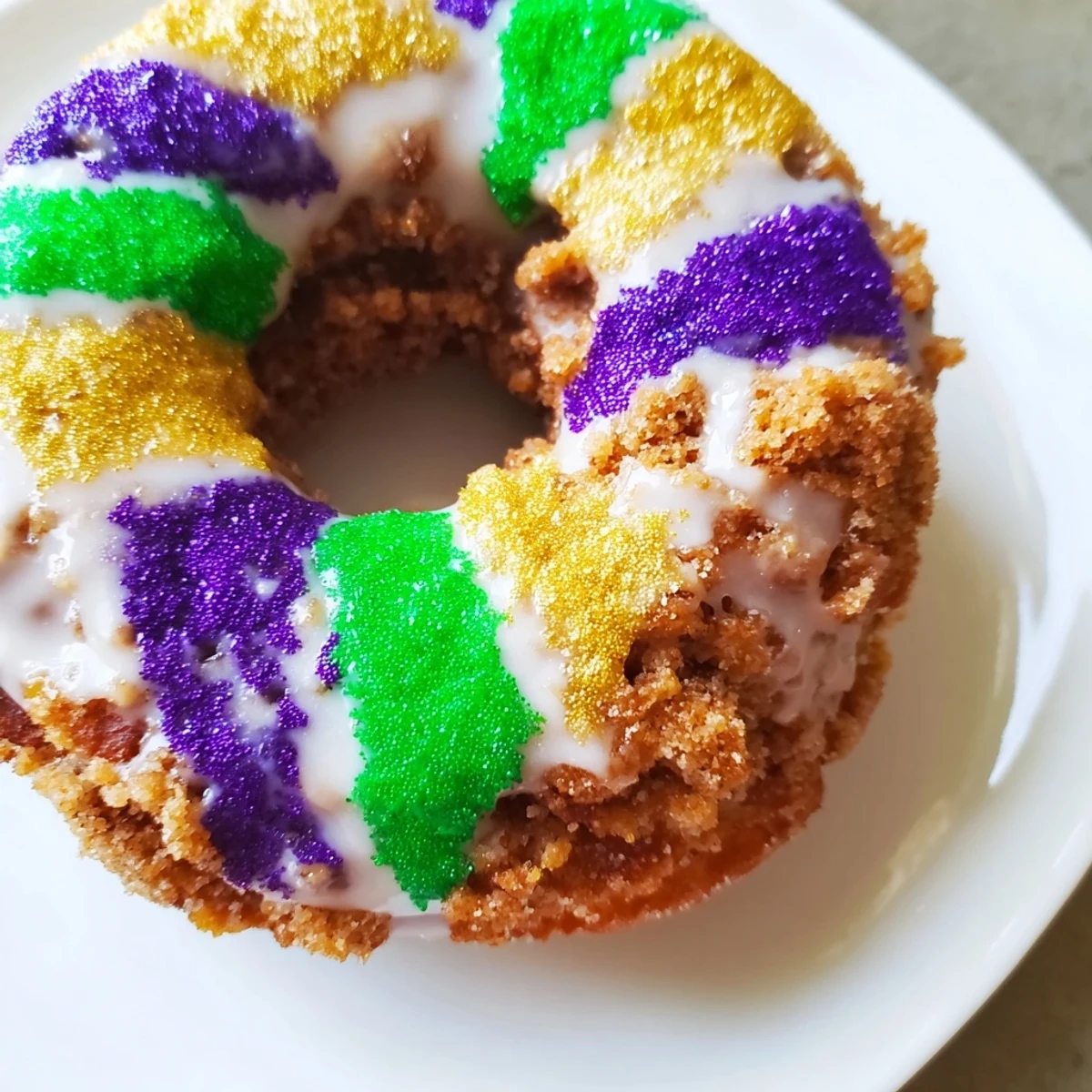 The topping uses purple, green, and gold colored sanding sugars, applied to resemble King Cake stripes.