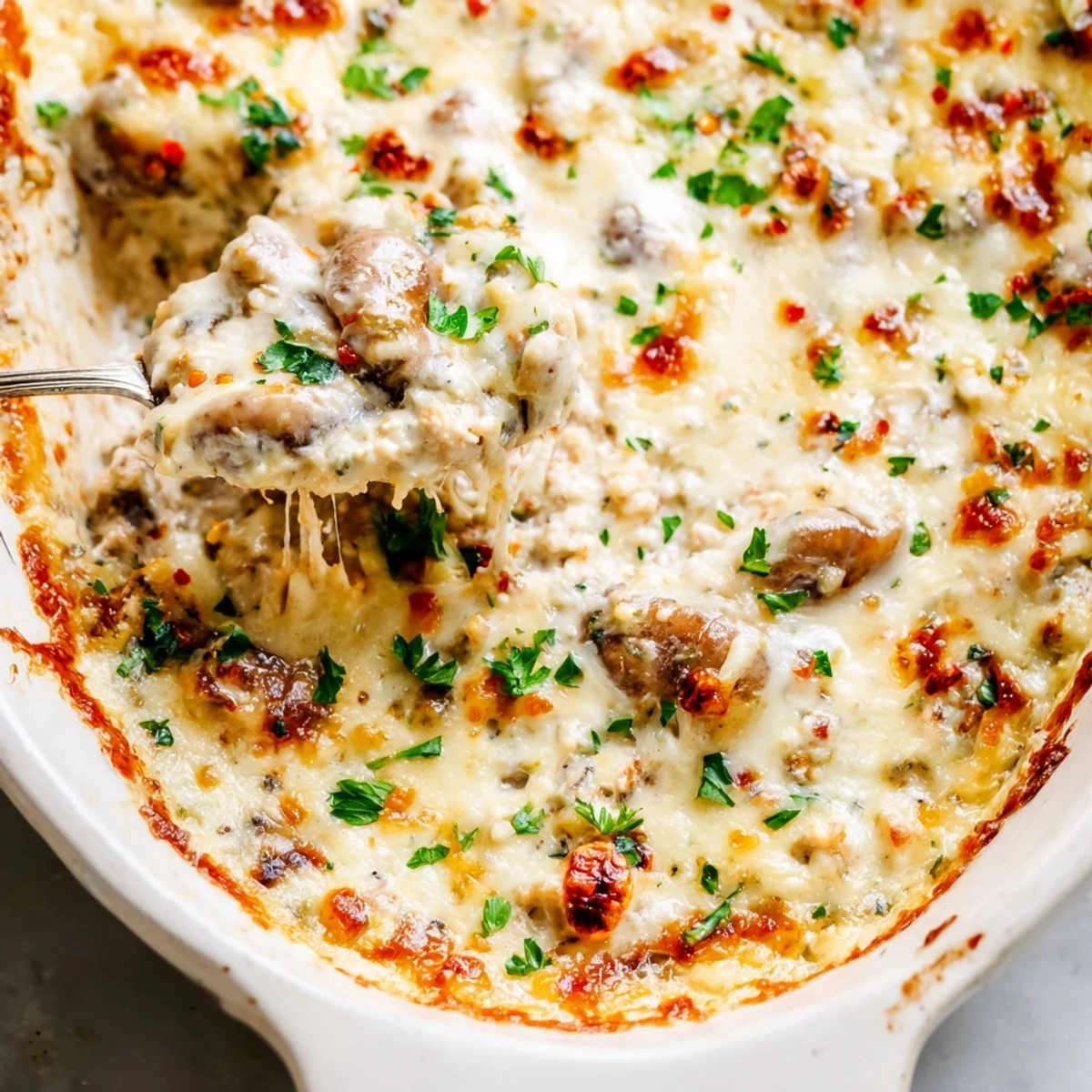 This indulgent appetizer combines earthy cremini mushrooms sautéed with shallots and garlic, then blended into a velvety base of cream cheese, sour cream, mozzarella, and Parmesan. The mixture bakes until golden and bubbly, creating a warm, savory dip that captures all the beloved flavors of classic stuffed mushrooms.